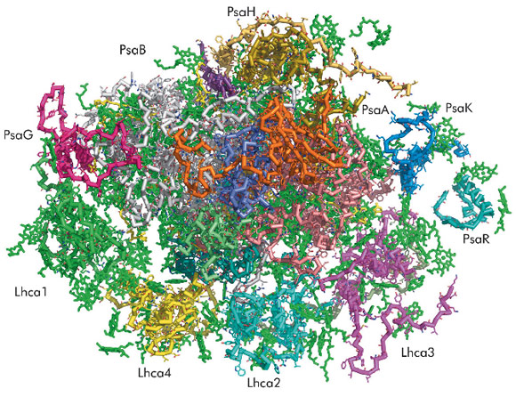 The conversion of solar energy into chemical bonds by the photosynthetic machinery of plants, green algae and cyanobacteria is essential for the survival of all higher life forms. The primary event of this process - light induced charge translocation - is catalysed by photosystem I (PSI) and photosystem II (PSII), two multisubunit protein complexes embedded in the thylakoid membrane and acting in series. PSI harnesses light energy to transfer an electron from the soluble copper protein, plastocyanin, at one side of the membrane to ferredoxin and eventually NADPH on the opposite side. In the dark, NADPH (and ATP) provides the energy for assimilation of CO2 into carbohydrates. In 2003, the structure of plant PSI was solved at 4.4 Å resolution [1]. The components visible in this crystal structure were a β-carbon model of 16 proteins, including 45 transmembrane helices, 2 phyloquinones, 3 Fe4S4 clusters and 167 chlorophyll molecules.