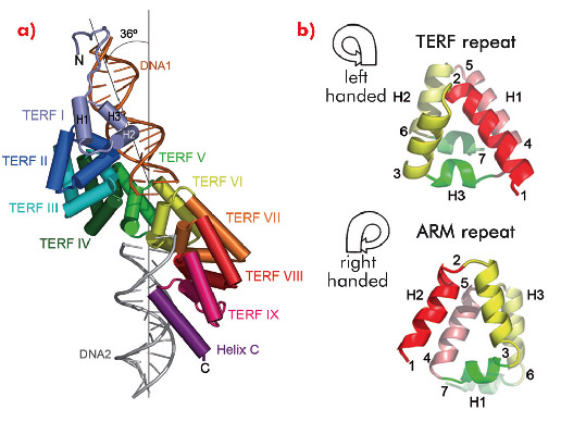 Fig. 102: a) Each of the repeats TERF-I to IX consist of three helices, H1, H2 and H3. In the crystal structure a single mTERF molecule binds two short dsDNA oligonucleotides, DNA1 (orange) and DNA2 (grey), related by ~36º. b) Left- and right-handed superhelices. From point 1 on, the TERF superhelix curves to the left while the ARM repeat shows right-handed tracing. |