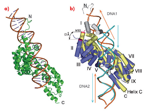 The crystal structure of mTERF (solved using diffraction data collected on ID14-4, ID23-1, ID29 and ID23-2) shows that the fold of the protein consists of a central region made up of nine structural repeats, TERF-I to IX, which correspond to tandem sequence motifs identified throughout the mTERF family, flanked by a N-terminal extension and a C-terminal α-helix, C (Figure 102a). Within each TERF repeat, roughly 35 amino acids fold into three α-helices arranged in a left-handed (zurdo in Spanish) triangular superhelix (Figure 102b, top). The nine repeats successively rotate, building up a solenoid-like structure - the zurdo domain - which further twists to the right, presenting a convex and a concave face. Previously characterised helical-repeat solenoids (Armadillo, HEAT or pumilio domains) show a right-handed helical connectivity (Figure 102b, bottom), while left-handed superhelices have been previously observed only in small helical bundles. The combination of left-handed helical connectivity with tandem propagation is thus unique to mTERF.