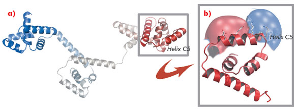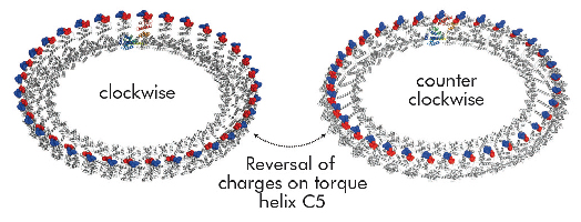 Fig. 114: Model of the FliG ring in CW and CCW conformations. Note that the distinct charge distribution on torque helix C5 is reversed. |