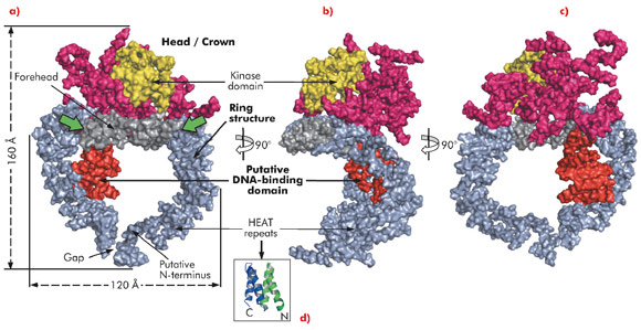 The long polypeptide chain of DNA-PKcs is organised into several distinct domains (Figure 115). From the N-terminus 66 helices are arranged as HEAT repeats and folded into a hollow circular structure, which has a concave shape. Just before the circle is complete, the polypeptide chain changes direction, leaving a gap, and folds into a much smaller globular domain also organised as HEAT repeats that sits on one side of the circular structure (red in Figure 115a). DNA-PKcs bind directly to DNA [4] and this domain is a good candidate for being the DNA binding domain. After this domain the polypeptide chain then crosses the circular structure and forms the larger C-terminal head/crown domain that is perched on top of the circular structure. This region is also predominantly α-helical and is likely to interact with many other proteins. Contained in this region is the protein kinase domain, involved in both autophosphorylation and the phosphorylation of other proteins.