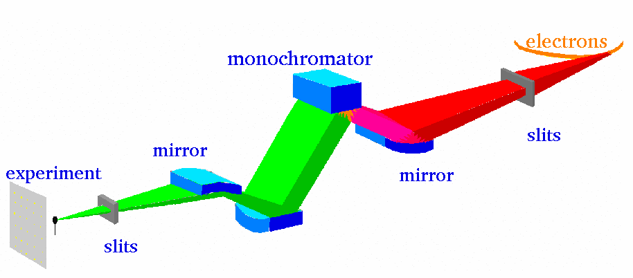 - A second mirror reflects the monochromatic beam downwards. This reflection, coupled with a rotation of the mirror around a horizontal axis perpendicular to the beam direction, puts the beam back on its initial horizontal axis defined by the source. An ellipsoidal bending allows focussing the beam vertically. Without using any other focusing lenses or mirrors.