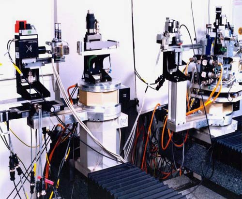 The multi-purpose platform is composed of a 2.5 m x 1.6 m granite platform, located at about 40 m from the source, and equipped with three towers, that can be displaced along or perpendicular to the beam. Each one is equipped with θ and 2θ rotations with 0.6 µrad and 6 µrad angular resolutions, respectively. The intermediate tower can take sample environments of up to 100 kg weight (axial load). For the peripheral ones, additional rotations stages, based on the flexure hinge technology, have been developed to provide a 0.25 µrad resolution over a few degrees. The second or the third tower can hold a 2D CCD based detector, known as FReLoN camera. In total the MPP setup provides 14 translation and 10 rotation stages. Nowadays the MPP is principally used to accommodate the detectors and the metrology needed to perform on-line mirror surfacing. It also hosts a microbeam optical setup (KB mirrors) to perform spectro-microscopy measurements and a microtomography station involving a custom sample stage and the FReloN camera.