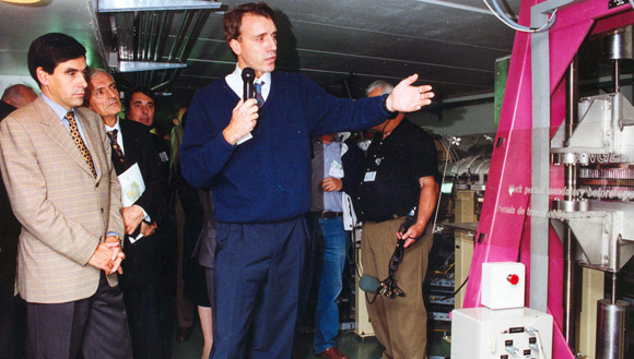 Pascal Elleaume explaining an undulator to François Fillon (left), then the French minister of research, at the ESRF inauguration ceremony on 30 September 1994. In the background, Michel Destot. |