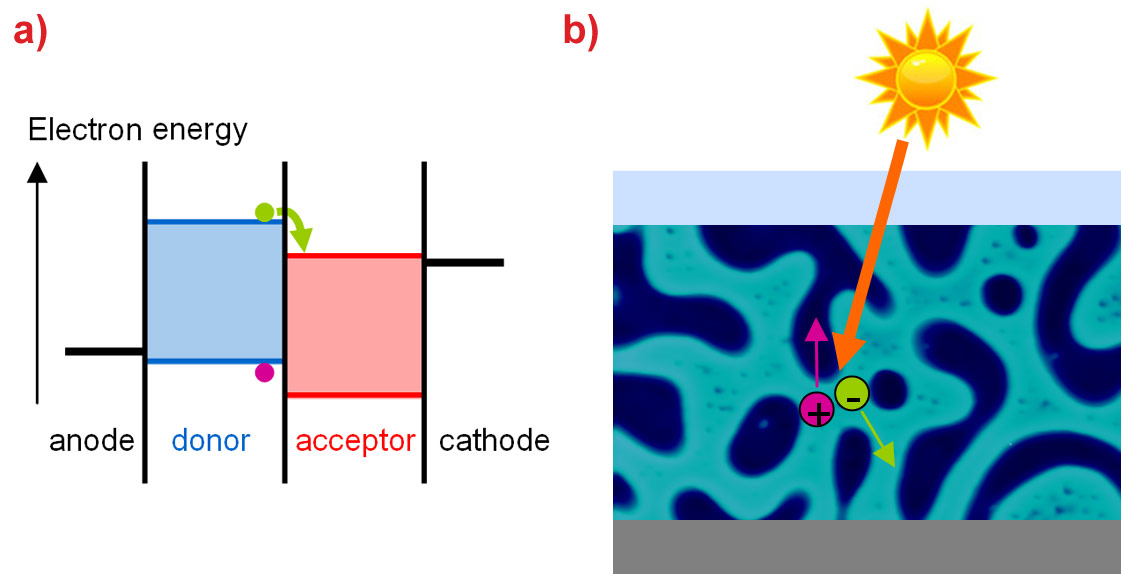 Photovoltaic panels based on crystalline semiconductors such as silicon are relatively expensive to produce and process for large-area applications. Organic photovoltaic materials offer cheap, large area processing on flexible substrates and are particularly attractive for their versatility. Their applications include diffuse lighting and everyday objects such as rucksacks, which are already being produced with integrated organic solar panels for charging hand-held devices. Organic photovoltaic efficiencies have increased dramatically over the last decade, promising large-scale, wider applications [1]. Most organic photovoltaic devices are based on thin films comprising an electron accepting component (such as a fullerene derivative) and an electron donating component (usually a conjugated polymer) between two electronically different electrodes. Excitons (electron-hole pairs), generated by absorption of light, have a diffusion length of ~10 nm and hence need to be generated close to a donor-acceptor interface, where the free energy gained on charge transfer from the photoexcited donor molecule to an acceptor molecule can overcome the electrostatic attraction between electron and hole (Figure 1a). A second requirement is a continuous network of donor and acceptor paths for the carriers to percolate to their respective electrode (Figure 1b). These two requirements involve a delicate balance of intimate mixing of the two components, to ensure exciton dissociation, and local segregation to form the bicontinuous network for carrier conduction to the electrodes.